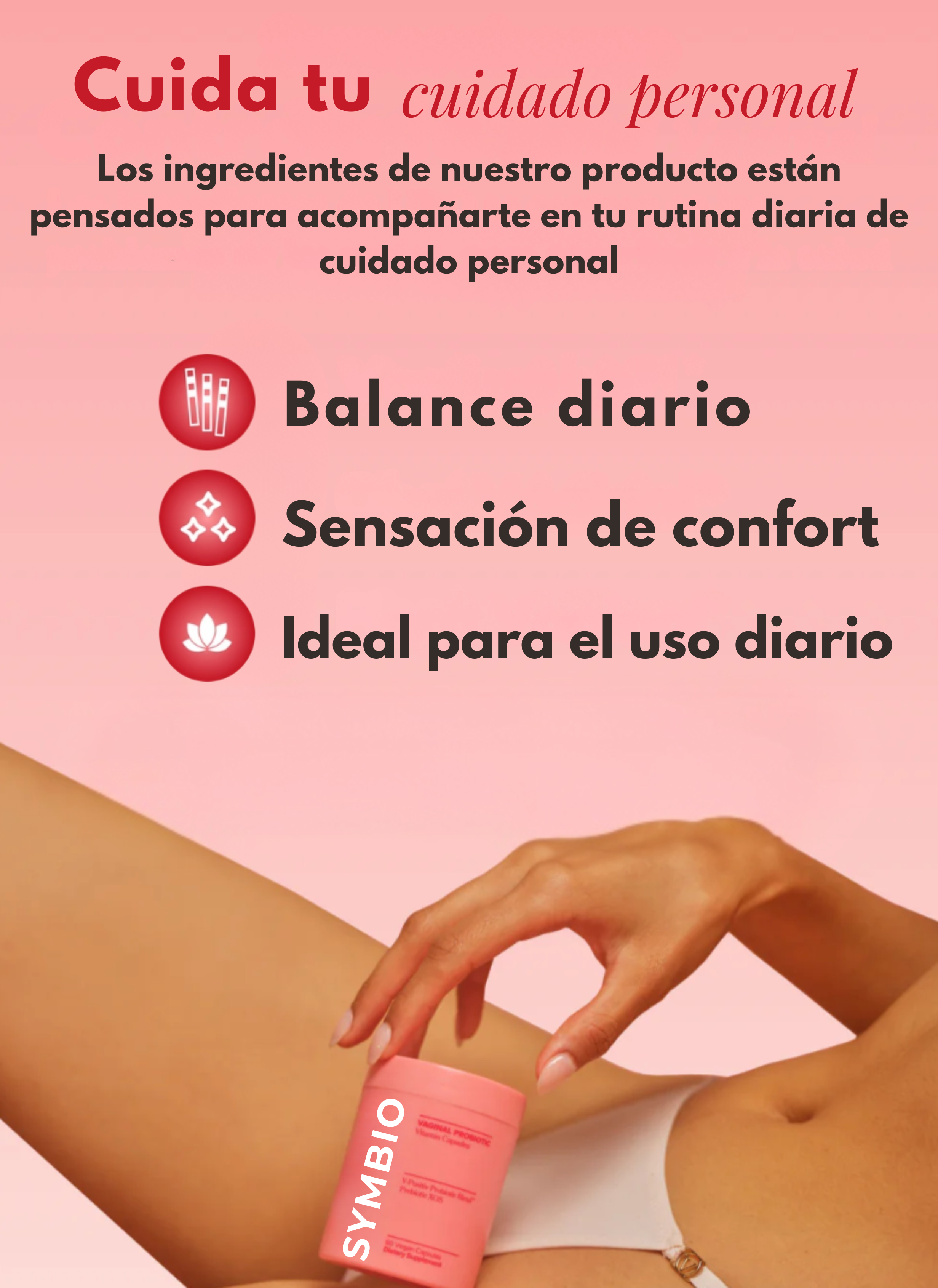Symbio está diseñado principalmente como un suplemento preventivo para mantener el cuidado personal y el equilibrio de tu día a día. No debe considerarse un tratamiento para infecciones existentes. Si sospechas de una infección, es importante consultar a un profesional de el cuidado para recibir el tratamiento adecuado.